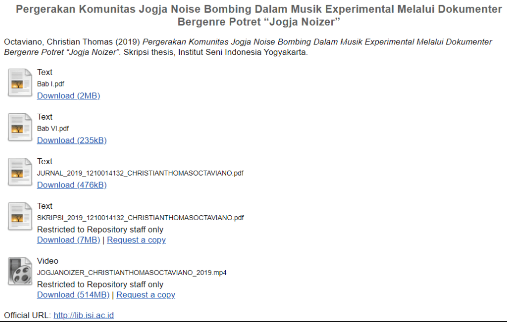 Karya tugas akhir Pergerakan Komunitas Jogja Noise Bombing Dalam Musik Experimental Melalui Dokumenter Bergenre Potret “Jogja Noizer” merupakan karya program dokumenter. Penciptaan karya dokumenter “Jogja Noizer” bertujuan untuk menciptakan program dokumenter musik noise dengan penggunaan genre potret, memberikan informasi kepada masyarakat tentang keberadaan dan pergerakan komunitas Jogja Noise Bombing dalam menyuarakan musik noise dari sub genre experimental agar musik noise semakin dikenal secara luas dan mengangkat derajat musik noise di Indonesia ke kancah Internasional melalui film dokumenter. Objek penciptaan karya seni film dokumenter “Jogja Noizer” menceritakan pergerakan sebuah komunitas melalui beberapa tokoh yaitu Indra Menus, Wednes Mandra, Adyt Arpapel, Akbar Wibowo yang memiliki pengalaman dan pandangan dalam musik noise. Karya dokumenter Jogja Noizer menggunakan struktur bertutur tematis dengan tema besar pergerakan komunitas Jogja Noise Bombing dalam musik experimental, yang terbagi menjadi tiga segmen. Setiap segmen memiliki pembahasan yang berbeda namun tetap dalam satu tema besar. Penggunaan visual-visual pengambaran suasana dalam setiap acara, didukung dengan penambahan efek motion foto menjadi sangat penting untuk mendukung alur cerita yang dibangun melalui statement wawancara dari setiap narasumber. Hal tersebut sebagai perwujudan kemasan dokumenter Jogja Noizer agar menjadi lebih bervariasi dalam setiap penyampaian informasi mengenai komunitas Jogja Noise Bombing.