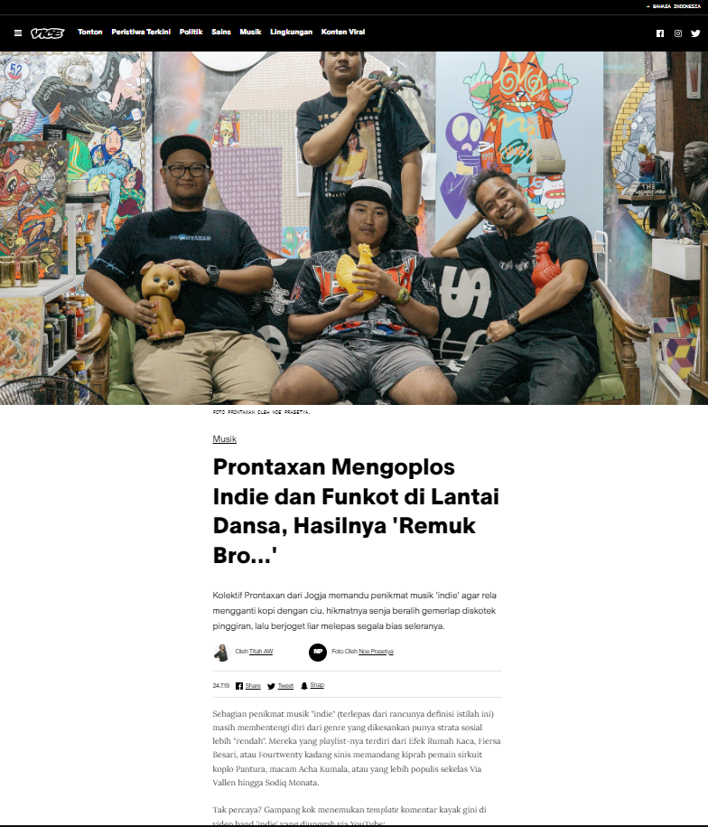 Kolektif Prontaxan dari Jogja memandu penikmat musik ‘indie’ agar rela mengganti kopi dengan ciu, hikmatnya senja beralih gemerlap diskotek pinggiran, lalu berjoget liar melepas segala bias seleranya.
