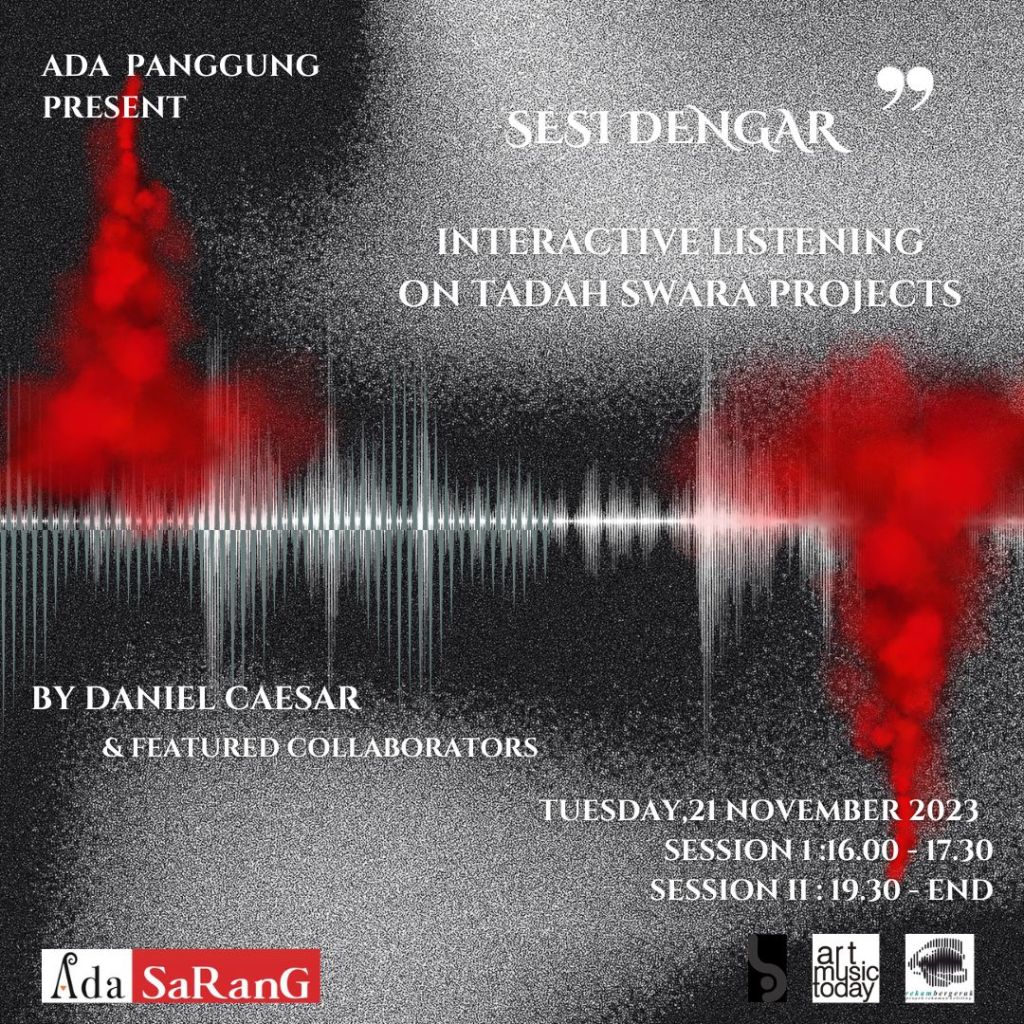 | 21 November 2023 Sesi I: 16.00-17.30 WIB Sesi II: 19.30-Selesai | Sesi Dengar: Interactive Listening On Tadah Swara Projects | Daniel Caesar dengan kolaborator: Bhakti Prasetyo, Dimawan Krisnowo Adji, Ikbal Lubys, Kevin Christopher ‘Guling’, Marcella Dee, Oscar Artunes, dan Ragipta Utama. Instalasi Visual: Ismoyo Adhi Host: The Freakshow Kurator: Gatot Danar Sulistyanto dan Ignatia Nilu | Ada Sarang, Yogyakarta | [1] |