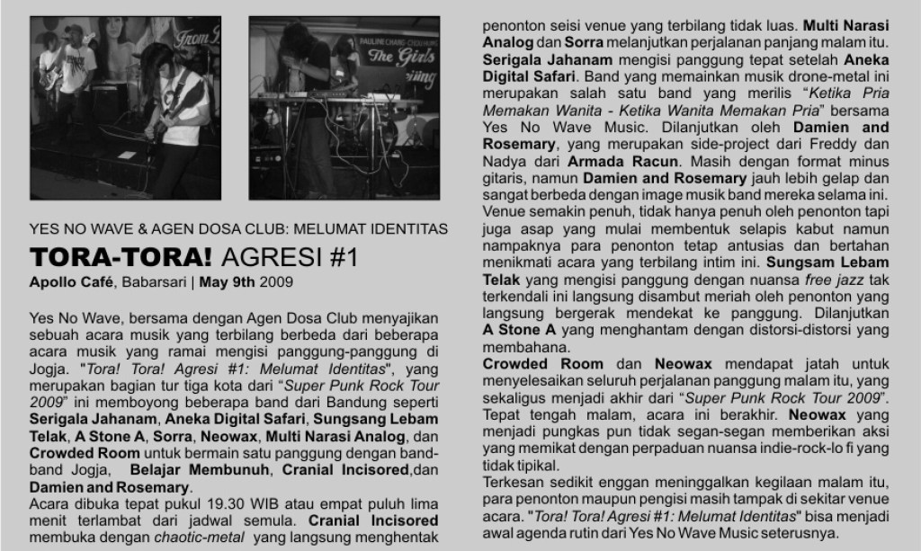 Artikel reportase tentang acara Tora-Tora Agresi #1 oleh Yes No Wave dan Agen Dosa Klub dengan tajuk “Melumat Identitas” yang melibatkan Belajar Membunuh.