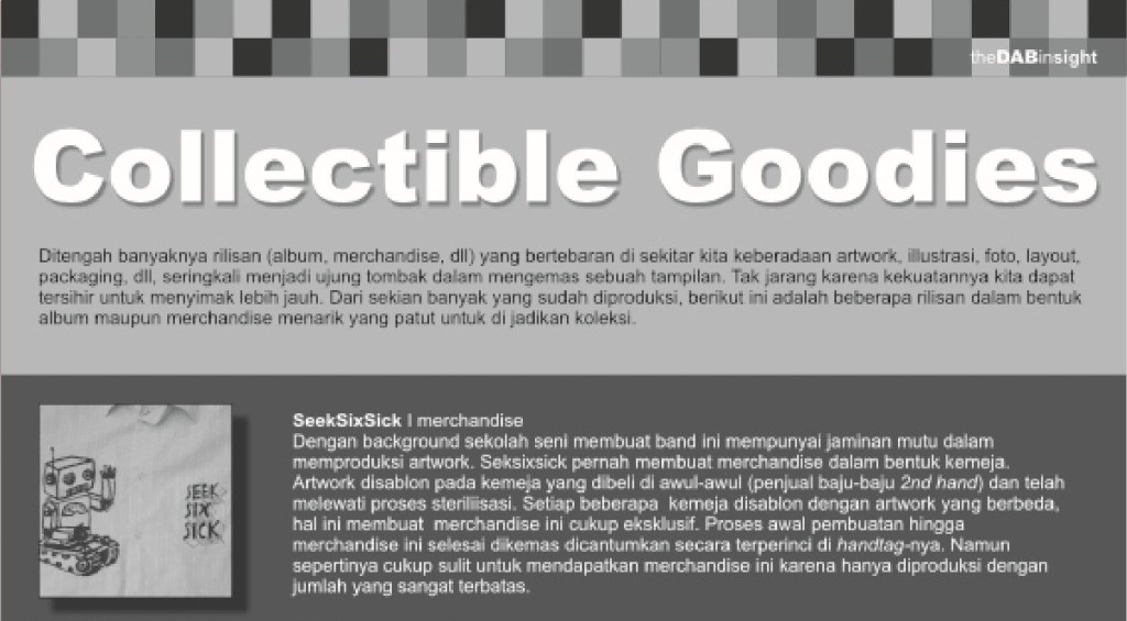 Rubrik collectible goodies dari Dynamic Aural Bliss Magazine yang menyebutkan artikel cendera mata Seek Six Sick sebagai salah satu darinya.
