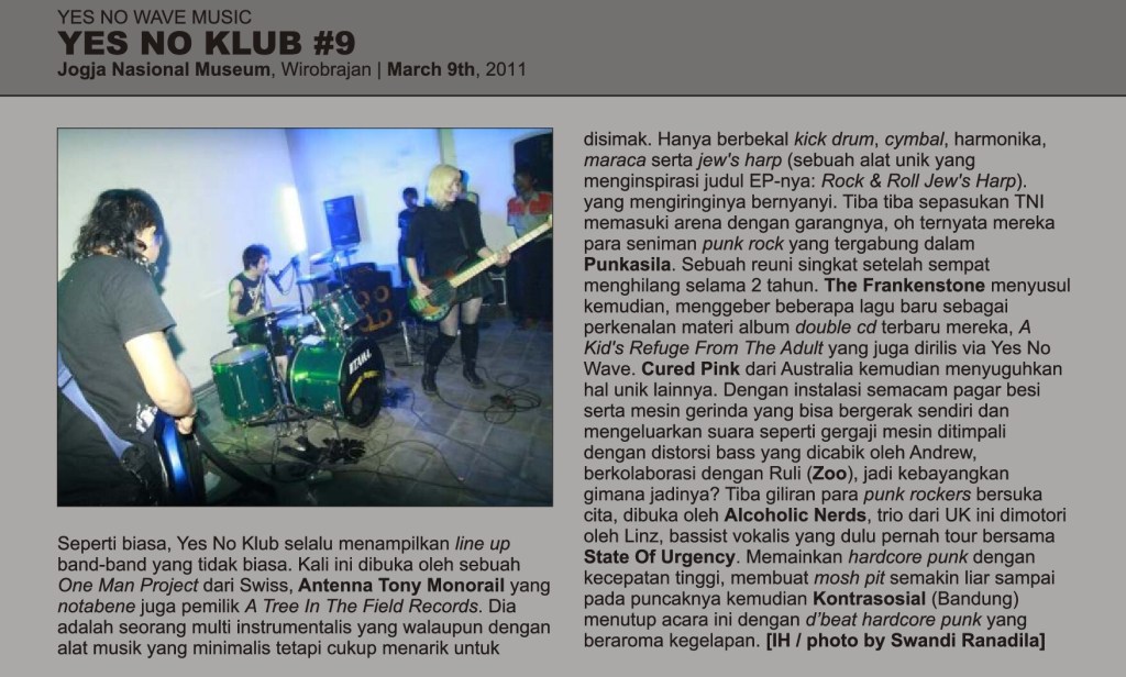 Artikel reportase tentang acara Yes No Klub #9 oleh Yes No Wave Music yang menampilkan kolaborasi Rully Shabara dengan Cured Pink di Jogja National Museum.