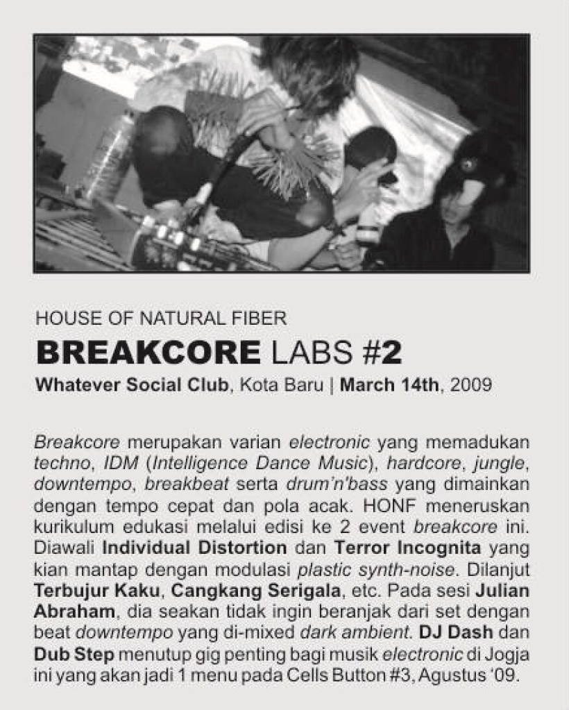 | 14 Maret | breakcore_LABS 0.2 – pork ear pork | Musik: – Cangkang Serigala – Individual Distortion – Terror Incognita – Terbujurkaku – Julian Abraham – DJ Dash – Electrocore – Godmode Visual: – VJ Number One – VJ Manticore – VJ Fajar LP – VJ Desire | Whatever Shop, Yogyakarta | [1] [2] [3] [4] |