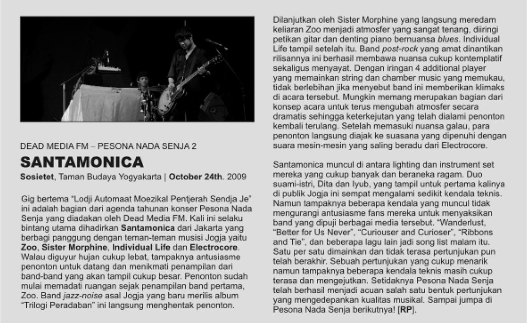 | 24 Oktober | Pesona Nada Senja #2 | Santamonica, Zoo, Sister Morphin, Individual Life, dan Electrocore | Taman Budaya Yogyakarta | [1] [2] [3] [4] |