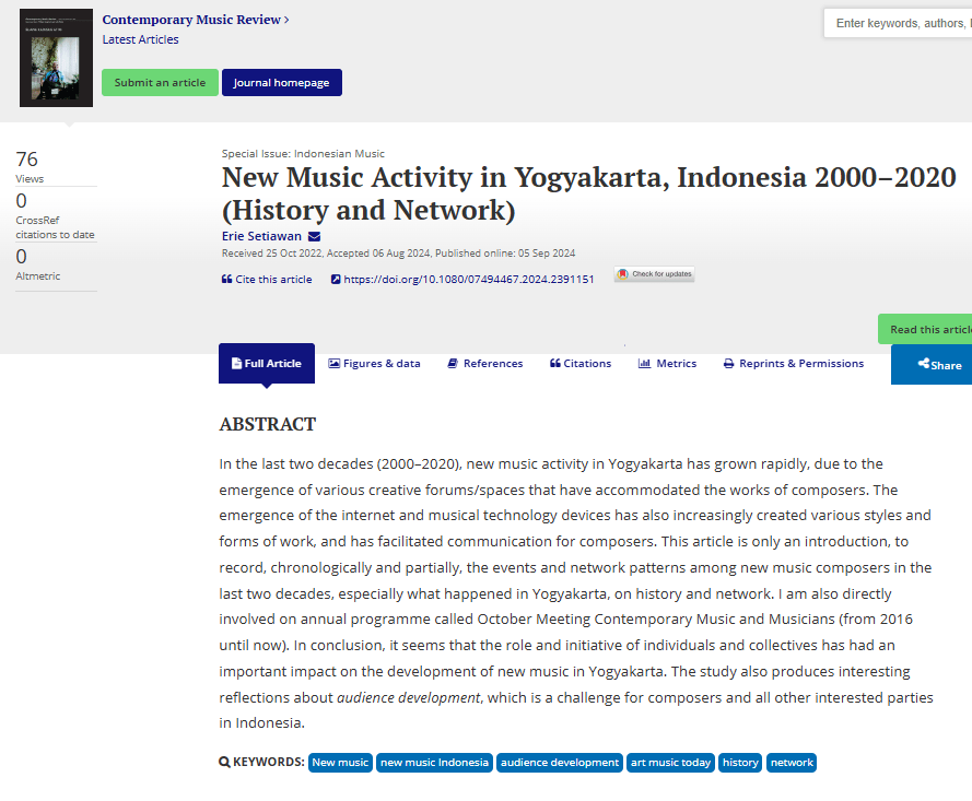 In the last two decades (2000–2020), new music activity in Yogyakarta has grown rapidly, due to the emergence of various creative forums/spaces that have accommodated the works of composers. The emergence of the internet and musical technology devices has also increasingly created various styles and forms of work, and has facilitated communication for composers. This article is only an introduction, to record, chronologically and partially, the events and network patterns among new music composers in the last two decades, especially what happened in Yogyakarta, on history and network. I am also directly involved on annual programme called October Meeting Contemporary Music and Musicians (from 2016 until now). In conclusion, it seems that the role and initiative of individuals and collectives has had an important impact on the development of new music in Yogyakarta. The study also produces interesting reflections about audience development, which is a challenge for composers and all other interested parties in Indonesia.