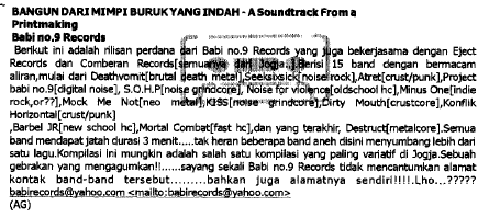 Resensi album “Vol. 1” dari label rekaman Babi No. 9 Records yang melibatkan Seek Six Sick, Prodjek Babi No. 9, dan Sound of Human Polution di Fightback! Zine Vol. 2.