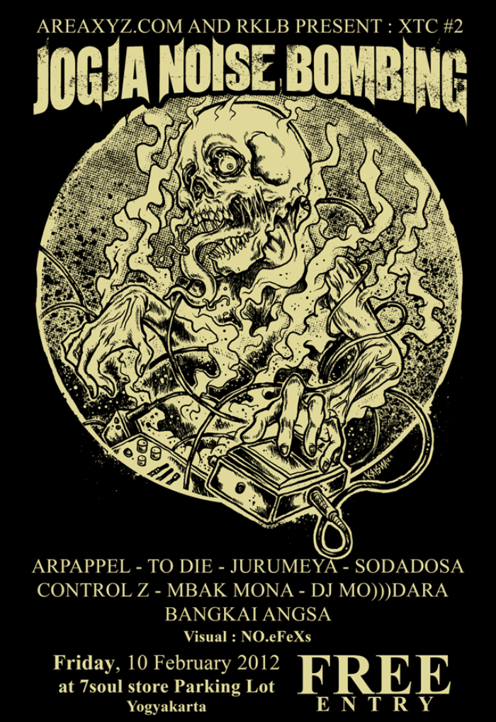 | 10 Februari | XTC #2 – Jogja Noise Bombing | Arpappel, To Die, Jurumeya (batal, digantikan oleh Manticore), Sodadosa (featuring Penyair Dubur), Control-Z (featuring Annamira Sophia Latuconsina), Mbak Mona, DJ MO)))DARA, dan NO.eFeXs | Seven Souls Store, Yogyakarta | [1] [2] |