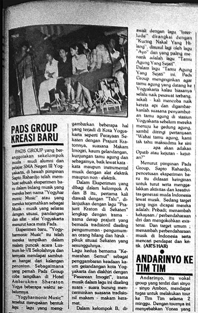 Saduran dari artikel Pads Group Kreasi Baru oleh Ar’s Hari di Majalah Aktuil Edisi 232 Tahun 1977: