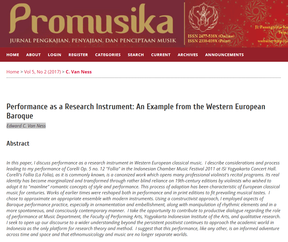 In this paper, I discuss performance as a research instrument in Western European classical music. I describe considerations and process leading to my performance of Corelli Op. 5 no. 12 “Follia” in the Indonesian Chamber Music Festival 2011 at ISI Yogyakarta Concert Hall. Corelli’s Follia (La Folia), as it is commonly known, is a canonized work which opens many professional violinist’s recital programs. Its real identity has become marginalized and transformed through rather blind reliance on 19th-century editions by violinists who wished to adopt it to “mainline” romantic concepts of style and performance. This process of adaption has been characteristic of European classical music for centuries. Works of earlier times were reshaped both in performance and in print editions to fit prevailing musical tastes. I chose to approximate an appropriate ensemble with modern instruments. Using a constructivist approach, I employed aspects of Baroque performance practice, especially in ornamentation and embellishment, along with manipulation of rhythmic elements and in a more spontaneous, and consciously contemporary manner. I take the opportunity to contribute to productive dialogue regarding the role of performance at Music Department, the Faculty of Performing Arts, Yogyakarta Indonesian Institute of the Arts, and qualitative research. I seek to open up our discourse to a wider understanding beyond the persistent positivist continues to approach the academic world in Indonesia as the only platform for research theory and method. I suggest that this performance, like any other, is an informed adventure across time and space and that ethnomusicology and music are no longer separate worlds.