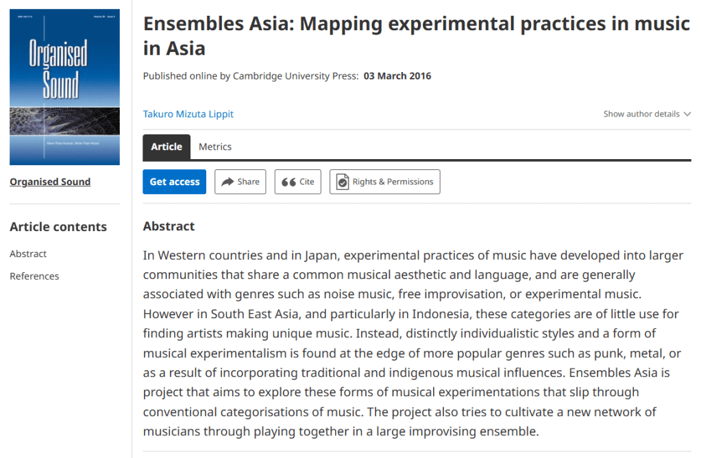 In Western countries and in Japan, experimental practices of music have developed into larger communities that share a common musical aesthetic and language, and are generally associated with genres such as noise music, free improvisation, or experimental music. However in South East Asia, and particularly in Indonesia, these categories are of little use for finding artists making unique music. Instead, distinctly individualistic styles and a form of musical experimentalism is found at the edge of more popular genres such as punk, metal, or as a result of incorporating traditional and indigenous musical influences. Ensembles Asia is project that aims to explore these forms of musical experimentations that slip through conventional categorisations of music. The project also tries to cultivate a new network of musicians through playing together in a large improvising ensemble.
