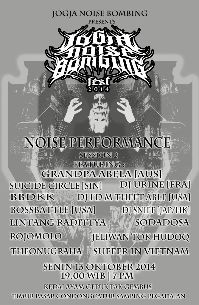 | 13 Oktober | Jogja Noise Bombing Fest Vol. 2 – Session 2 | Grandpa Abela, Suicide Circle, DJ Urine, BBDKK, DJ I’D M THFFT ABLE, Bossbattle, DJ Sniff, Lintang Radittya, Sodadosa, Rojomolo, Jeliwan Tok Hudoq, Theonugraha, dan Suffer In Vietnam | Kedai Ayam Gepuk Pak Gembus, Yogyakarta | [1] [2] [3] |