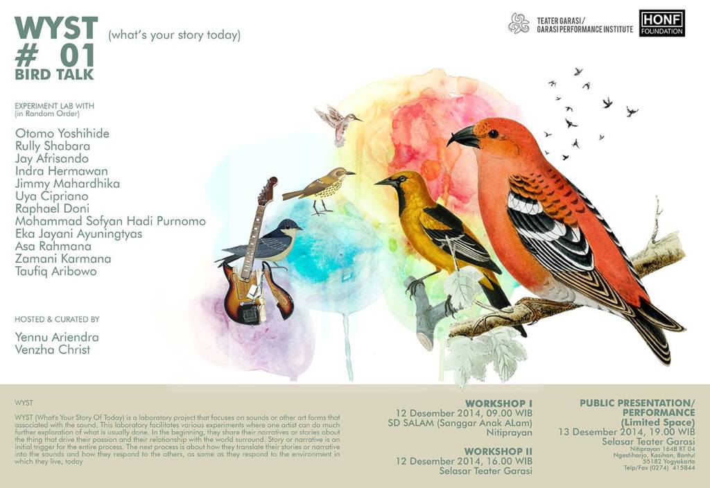 | 13 Desember 2014 | WYST #1: Birdtalk – Prersentasi: – Gemuruh Sendu (Asa Rahmana, Jay Afrisando, Sofyan Hadi Purnomo, dan Taufiq Aribowo) – Titik Kebahagiaan (Indra Hermawan, Rully Shabara, Uya Cipriano, dan Zamani Karmana) – The Spiritual (Eka Jayani Ayuningtyas, Jimmy Mahardhika, dan Otomo Yoshihide) | Teater Garasi, Yogyakarta | [1] [2] [3] [4] [5] |