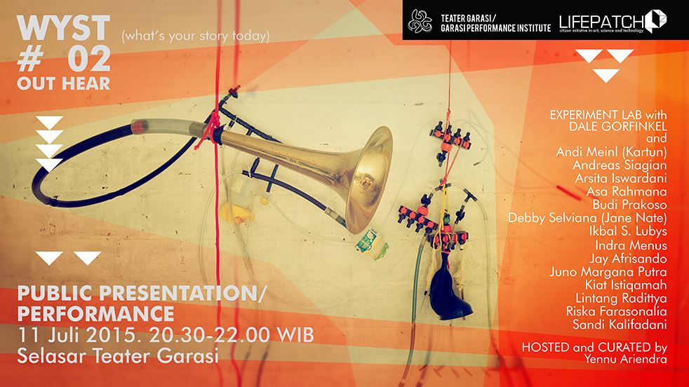 | 11 Juli 2015 | WYST #02: Out Hear – Presentasi: – Performance (daftar nama seniman tidak tersedia) – Presentasi Pertama (Andi Meinl, Juno Margana Putra, dan Sandi Kalifadani) – Presentasi Kedua (Arsita Iswardani dan Kiat Istiqamah) – Presentasi Kegita (Andreas Siagian, Ikbal S. Lubys, dan Lintang Radittya) | Teater Garasi, Yogyakarta | [1] [2] [3] [4] [5] [6] [7] |