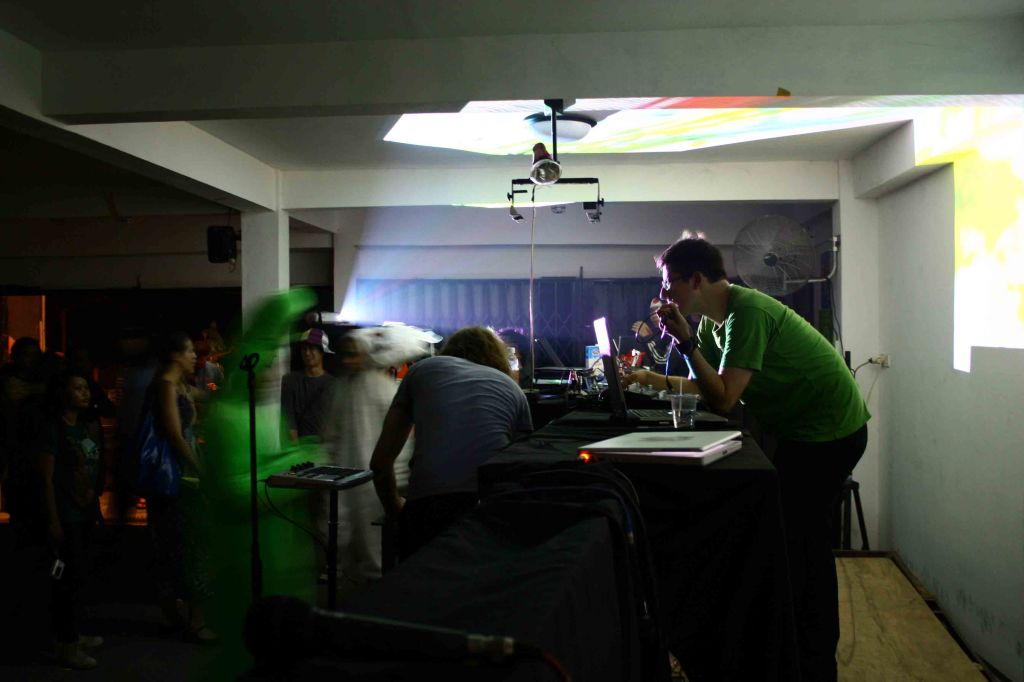 After stage installed compromising the space in Slackers Distro, breakcore_LABS started with a special performance from Somaya Langley. Her performance was a body motion synchronized generated audiovisual performance. Using her body movement, she created digital sound composition and visuals that projected to her body. After her performance, Andrej Boleslavsky played dub step music for the audience breakcore_LABS to dance. Terbujur Kaku continued with his digital breakcore music breaking the dance scenes that was filled with audience dancing with their costumes. Terbujur Kaku recently released his new album Glitchy Bitchy No.3 that is available for download online on his myspace account (http://www.myspace.com/bedebahsampaimati).