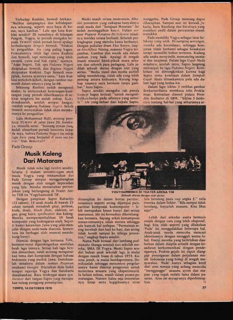 Sampai saat ini kecuali Jakarta, baru Bandung dan Surabaya yang memberi andil dalam percaturan musik mutakhir. Pads memiliki Yogya sebagai latar belakang yang unik. Di samping semangat, mereka ada kecerdasan sehingga kesegaran tidak berhenti sebagai kenakalan tetapi memiliki bobot tertentu. Kadang ada usaha menyindir, memancing asosiasi dan imajinasi. Dalam lagu Gajah Mada misalnya, setelah intro, Sapto langsung melompat ke lagu Padamu Negeri. Kombinasi ini dimungkinkan karena bagi Sapto tema kesetiaan dalam Sumpah Gajah Mada dirasakannya pula ada dalam lagu yang kedua itu. Dalam lagu Siklus 5 terlihat gambar Soekarno-Hatta membaca teks Proklamasi. Kemudian disusul pidato Presiden Soeharto di DPR. “Siklus 5 berbicara tentang hal-hal yang seharusnya selalu berulang pada tiap angka 5,” tulis mereka dalam folder. “Bila sampai tidak berulang, buyarlah suasana. Kita lihat saja!”