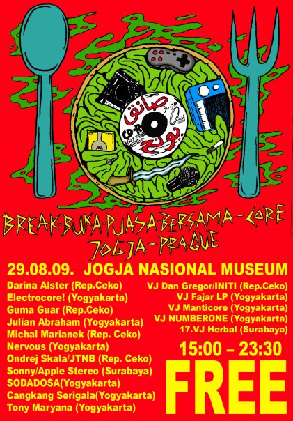 | 29 Agustus 2009 | breakcore_LABS 0.4 – break-buka-puasa-bersama Yogyakarta-Prague | Musik: – Cangkang Serigala – Darina Alster – Electrocore – Guma Guar – Julian Abraham – Sodadosa – Michal Marianek – Nervous – Ondrej Skala/JNTB – Sonny/Apple Stereo – Sudjud Dartanto – Tonny Maryana Visual: – VJ Dan Gregor/INITI – VJ Fajar LP – VJ Manticore – VJ NUMBERONE – VJ Herbal | Jogja National Museum | [1] [2] [3] [4] |