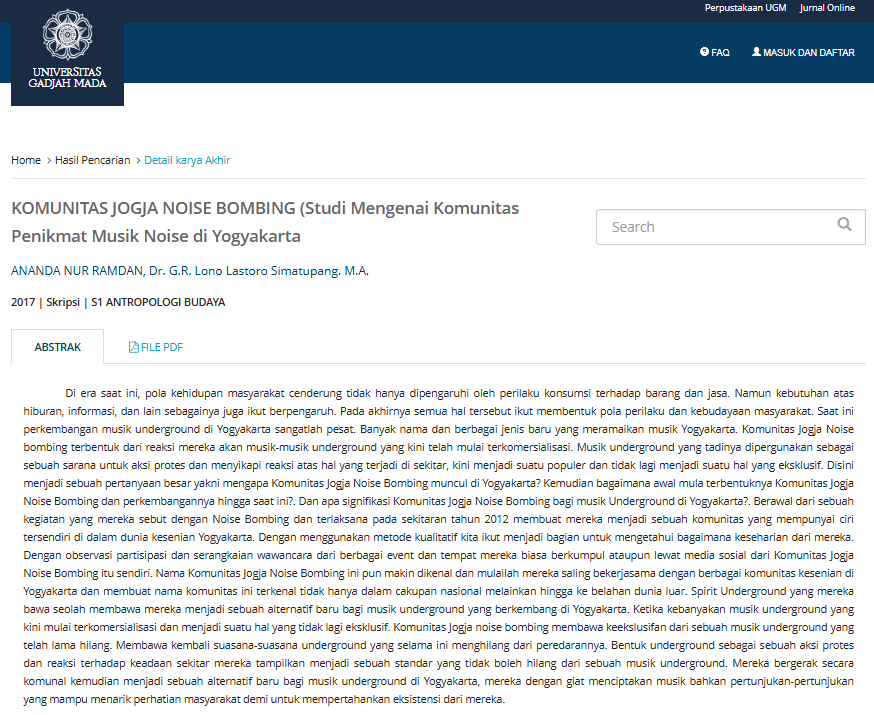 Di era saat ini, pola kehidupan masyarakat cenderung tidak hanya dipengaruhi oleh perilaku konsumsi terhadap barang dan jasa. Namun kebutuhan atas hiburan, informasi, dan lain sebagainya juga ikut berpengaruh. Pada akhirnya semua hal tersebut ikut membentuk pola perilaku dan kebudayaan masyarakat. Saat ini perkembangan musik underground di Yogyakarta sangatlah pesat. Banyak nama dan berbagai jenis baru yang meramaikan musik Yogyakarta. Komunitas Jogja Noise bombing terbentuk dari reaksi mereka akan musik-musik underground yang kini telah mulai terkomersialisasi. Musik underground yang tadinya dipergunakan sebagai sebuah sarana untuk aksi protes dan menyikapi reaksi atas hal yang terjadi di sekitar, kini menjadi suatu populer dan tidak lagi menjadi suatu hal yang eksklusif. Disini menjadi sebuah pertanyaan besar yakni mengapa Komunitas Jogja Noise Bombing muncul di Yogyakarta? Kemudian bagaimana awal mula terbentuknya Komunitas Jogja Noise Bombing dan perkembangannya hingga saat ini?. Dan apa signifikasi Komunitas Jogja Noise Bombing bagi musik Underground di Yogyakarta?. Berawal dari sebuah kegiatan yang mereka sebut dengan Noise Bombing dan terlaksana pada sekitaran tahun 2012 membuat mereka menjadi sebuah komunitas yang mempunyai ciri tersendiri di dalam dunia kesenian Yogyakarta. Dengan menggunakan metode kualitatif kita ikut menjadi bagian untuk mengetahui bagaimana keseharian dari mereka. Dengan observasi partisipasi dan serangkaian wawancara dari berbagai event dan tempat mereka biasa berkumpul ataupun lewat media sosial dari Komunitas Jogja Noise Bombing itu sendiri. Nama Komunitas Jogja Noise Bombing ini pun makin dikenal dan mulailah mereka saling bekerjasama dengan berbagai komunitas kesenian di Yogyakarta dan membuat nama komunitas ini terkenal tidak hanya dalam cakupan nasional melainkan hingga ke belahan dunia luar. Spirit Underground yang mereka bawa seolah membawa mereka menjadi sebuah alternatif baru bagi musik underground yang berkembang di Yogyakarta. Ketika kebanyakan musik underground yang kini mulai terkomersialisasi dan menjadi suatu hal yang tidak lagi eksklusif. Komunitas Jogja noise bombing membawa keekslusifan dari sebuah musik underground yang telah lama hilang. Membawa kembali suasana-suasana underground yang selama ini menghilang dari peredarannya. Bentuk underground sebagai sebuah aksi protes dan reaksi terhadap keadaan sekitar mereka tampilkan menjadi sebuah standar yang tidak boleh hilang dari sebuah musik underground. Mereka bergerak secara komunal kemudian menjadi sebuah alternatif baru bagi musik underground di Yogyakarta, mereka dengan giat menciptakan musik bahkan pertunjukan-pertunjukan yang mampu menarik perhatian masyarakat demi untuk mempertahankan eksistensi dari mereka.