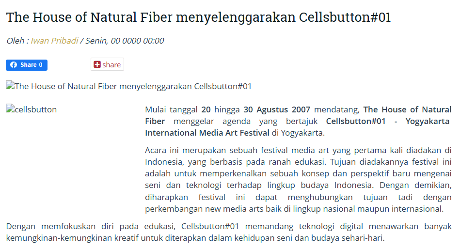 Mulai tanggal 20 hingga 30 Agustus 2007 mendatang, The House of Natural Fiber menggelar agenda yang bertajuk Cellsbutton#01 – Yogyakarta International Media Art Festival di Yogyakarta.