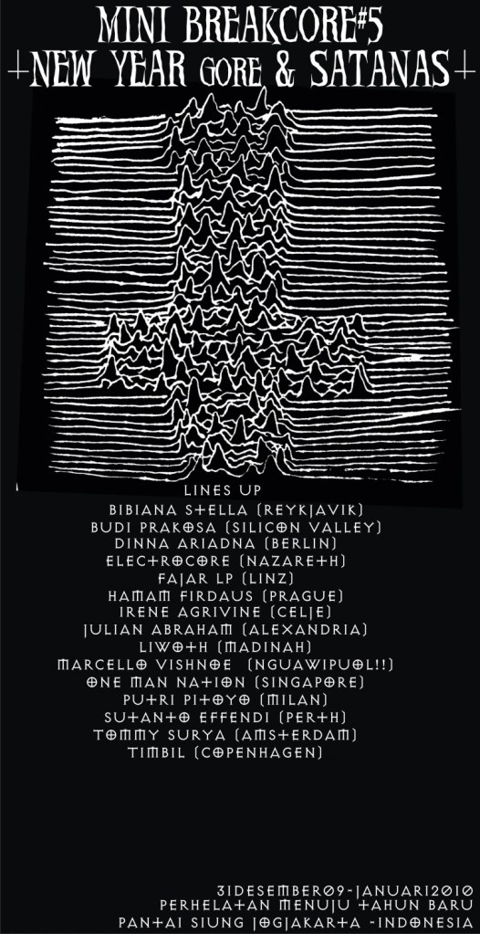 | 29 Agustus 2009 | breakcore_LABS 0.5 – Mini Breakcore #5 † New Year Gore & Satanas † | Bibiana Stella, Budi Prakosa, Dinna Ariadna, Electrocore, Fajar LP, Hamam Firdaus, Irene Agrivine, Julian Abraham, Liwoth, Marcello Vishnoe, One Man Nation, Putri Pitoyo, Sutanto Effendi, Tommy Surya, dan Timbil | Pantai Siung, Yogyakarta | [1] [2] [3] |