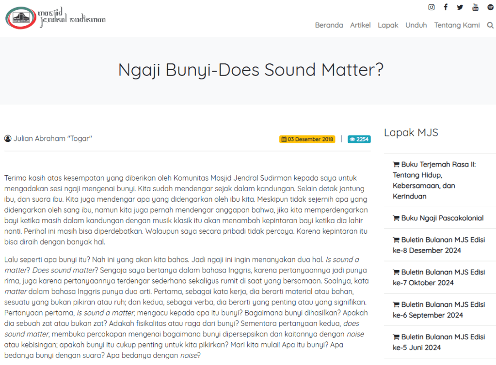 Terima kasih atas kesempatan yang diberikan oleh Komunitas Masjid Jendral Sudirman kepada saya untuk mengadakan sesi ngaji mengenai bunyi. Kita sudah mendengar sejak dalam kandungan. Selain detak jantung ibu, dan suara ibu. Kita juga mendengar apa yang didengarkan oleh ibu kita. Meskipun tidak sejernih apa yang didengarkan oleh sang ibu, namun kita juga pernah mendengar anggapan bahwa, jika kita memperdengarkan bayi ketika masih dalam kandungan dengan musik klasik itu akan menambah kepintaran bayi ketika dia lahir nanti. Perihal ini masih bisa diperdebatkan. Walaupun saya secara pribadi tidak percaya. Karena kepintaran itu bisa diraih dengan banyak hal.