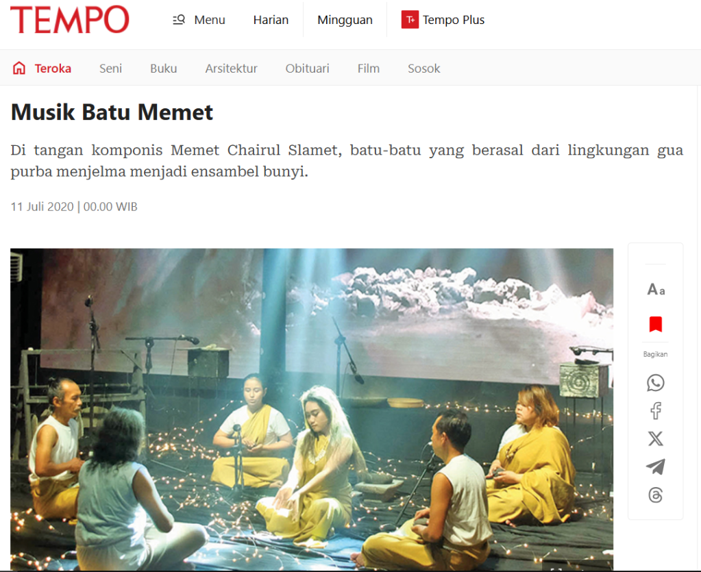 Keindahan stalaktit, stalagmit, warna bebatuan, dan musik yang mirip pentatonik gamelan itulah yang mengilhami Memet menciptakan pertunjukan musik batu secara daring di tengah pagebluk virus corona. Memet menyuguhkan konser musik batu tanpa nada. “Konsep musik batu membebaskan bunyi sesuai dengan kodratnya. Biarkan alam berbunyi sebagaimana mestinya,” katanya. Batu sebagai medium seni yang miskin resonansi membuat Memet tertantang untuk mengatasinya. Dia mengakalinya dengan cara menggantung batu seperti seni instalasi dan menata fosil batu di atas spons.