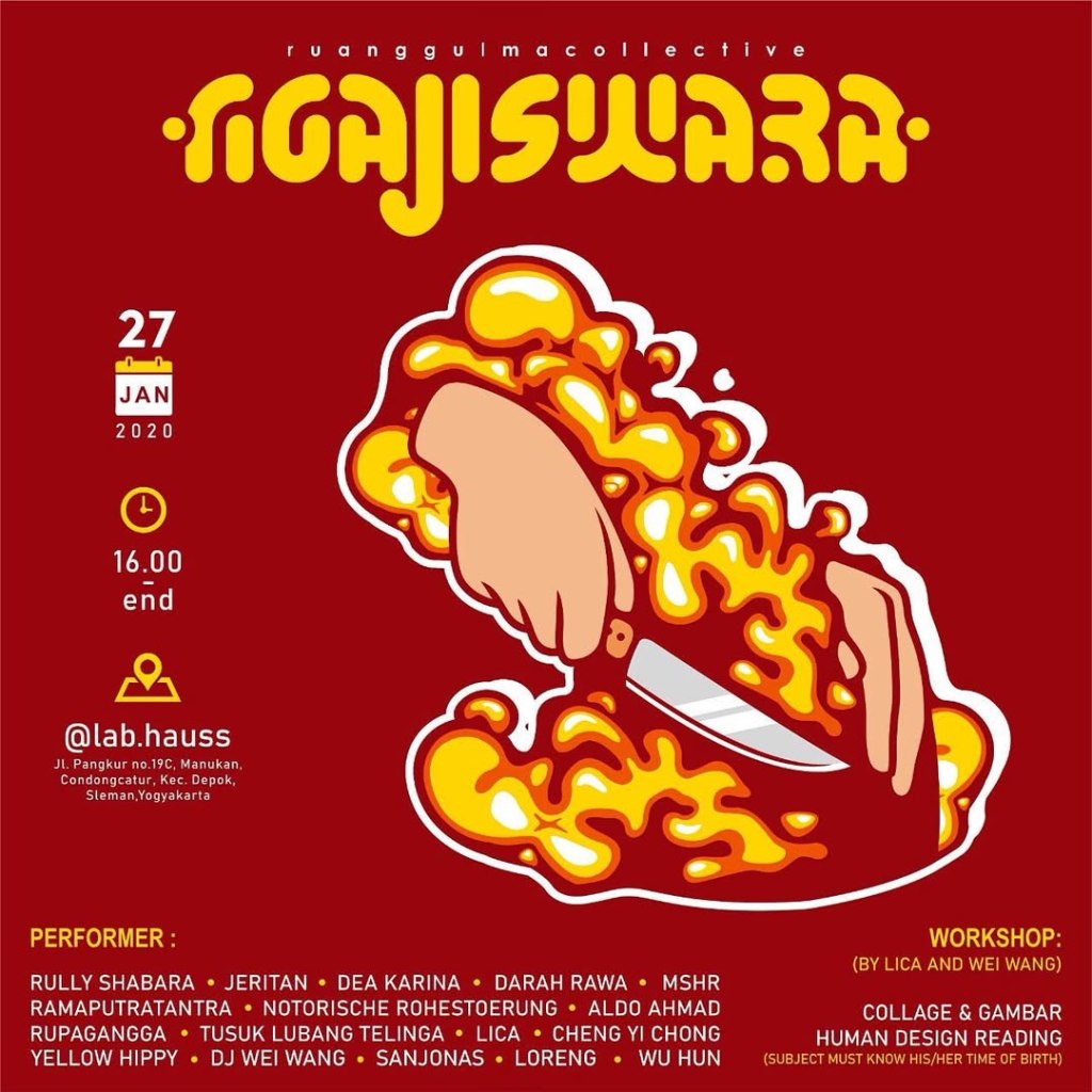 | 27 Januari | Ngajiswara x LabHauss | Musik: – Rully Shabara – Jeritan – Dea Karina – Darah Rawa – MSHR – Ramaputratantra – Notorische Rohestoerung – Aldo Ahmad – Rupagangga – Tusuk Lubang Telinga – Lica – Cheng Yi Chong – Yellow Hippy – DJ Wei Wang – Sanjonas – Loreng – Wu Hun Lokakarya: – Lica dan Wei Wang | LabHauss, Yogyakarta | [1] |
