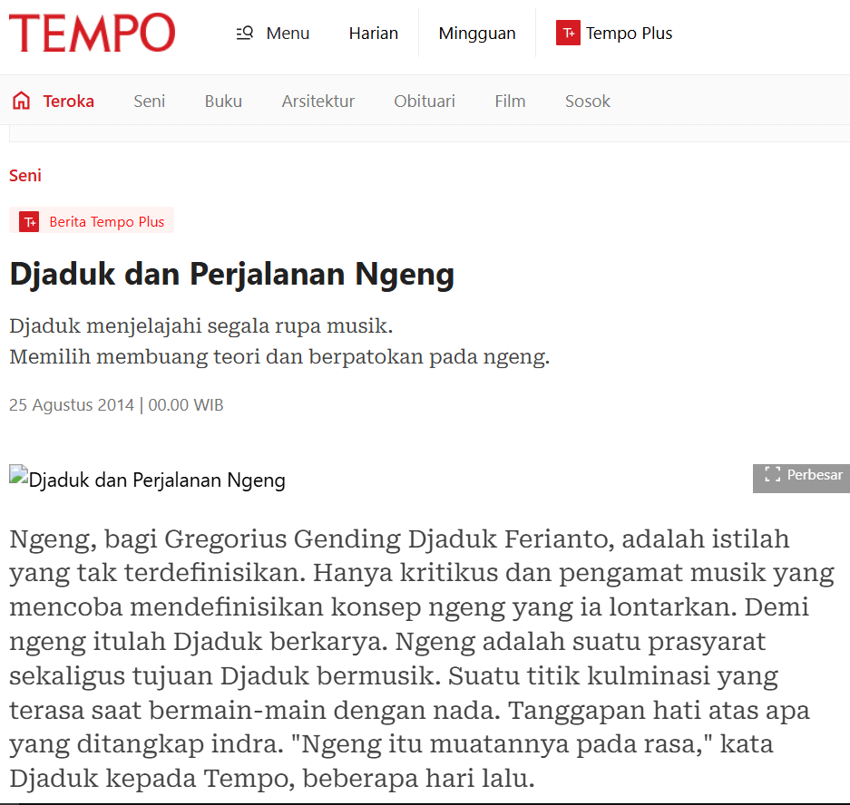 Ngeng pula yang hendak dicapai dalam konser Djaduk dan Kua Etnika bertajuk “Gending Djaduk: 50 Tahun Djaduk Ferianto” yang digelar di Graha Bhakti Budaya, Taman Ismail Marzuki, Jakarta, 13 Agustus lalu. Repertoarnya berisi tembang-tembang anyar yang menunjukkan gaya terbaru Djaduk di Kua Etnika. Ada sembilan lagu yang dimainkan, yakni Picnik ke Cibulan, Jawa Dwipa, Bethari, Pesisir, Angop, Swarnadwipa, Barong, Molukken (Kole-kole), dan Ritma Khatulistiwa.