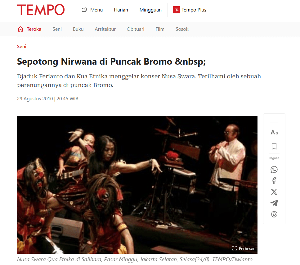 Djaduk Ferianto dan Kua Etnika menggelar konser Nusa Swara. Terilhami oleh sebuah perenungannya di puncak Bromo.