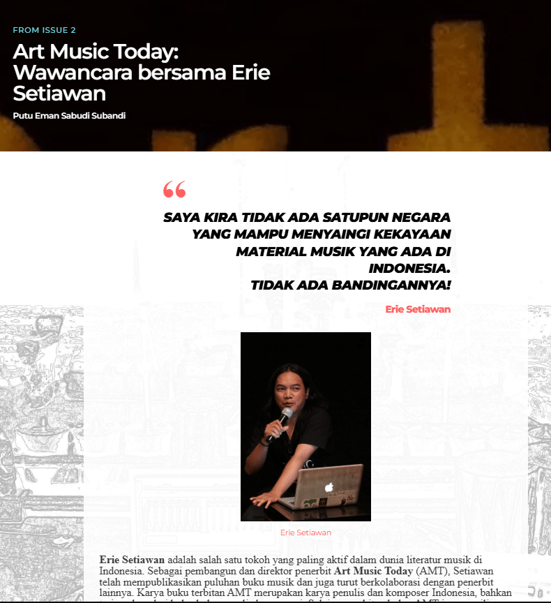 Erie Setiawan adalah salah satu tokoh yang paling aktif dalam dunia literatur musik di Indonesia. Sebagai pembangun dan direktor penerbit Art Music Today (AMT), Setiawan telah mempublikasikan puluhan buku musik dan juga turut berkolaborasi dengan penerbit lainnya. Karya buku terbitan AMT merupakan karya penulis dan komposer Indonesia, bahkan terjemahan dari buku-buku penulis luar negeri. Selain penerbitan buku, AMT juga merilis rekaman audio berupa CD, diantaranya rekaman gamelan, jazz, musik kontemporer, musik klasik, world music, dan sebagainya. Setiawan dan rekan-rekannya juga sering membuat acara musik di Yogyakarta, seperti konser, workshop, dan seminar untuk memperluaskan pemahaman pendengar musik kontemporer di Indonesia khususnya. Saya mengetahui Setiawan sebelumnya hanya melalui sosial media dan belum pernah bertemu langsung. Dengan rasa kagum, saya berkehendak menghubungi Setiawan untuk ingin mengetahui tentang bagaimana hubunganya antara aktivitasnya Art Music Today secara lebih dalam. Berikut adalah hasil wawancara saya dengan Setiawan.