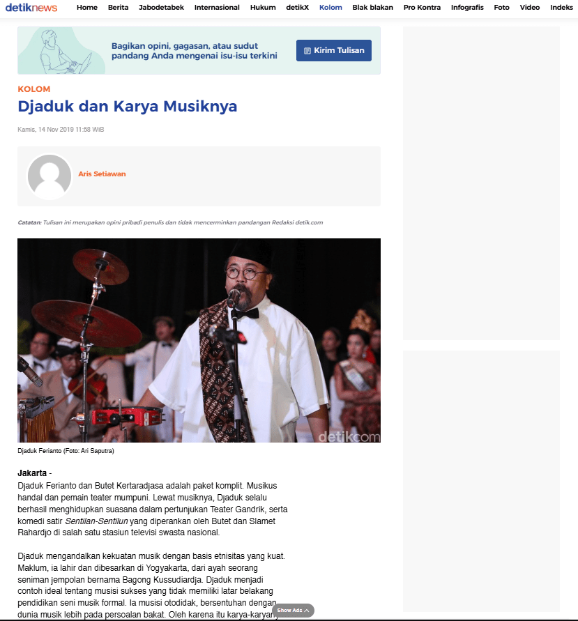 Djaduk adalah garansi bagi musik Indonesia bermutu. Uniknya, temuan ide-ide kekaryaan tidak terjadi dalam sebuah laboratorium formal di kelas-kelas musik, tapi lewat pengembaraan hidup. Sebagaimana dikisahkan oleh Butet Kertaradjasa lewat status Facebook-nya sesaat setelah adik bungsunya itu meninggal dunia karena sakit jantung, Rabu (13/11) kemarin, Djaduk begitu gembira karena berhasil menemukan melodi untuk karya terbarunya.