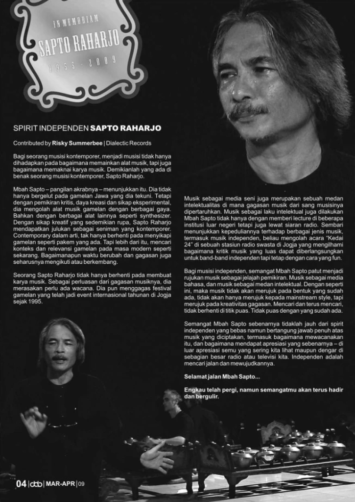 Masih banyak lagi catatan penting terkait ulang-alik praktik Sapto Raharjo dalam rimba kompleksitas gamelan, pembentukan Komunitas Gayam 16 dan prakarsa Yogyakarta Gamelan Festival misalnya, yang juga bisa Anda telusur lebih lanjut di sini.