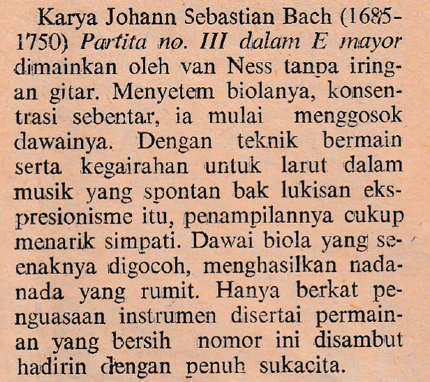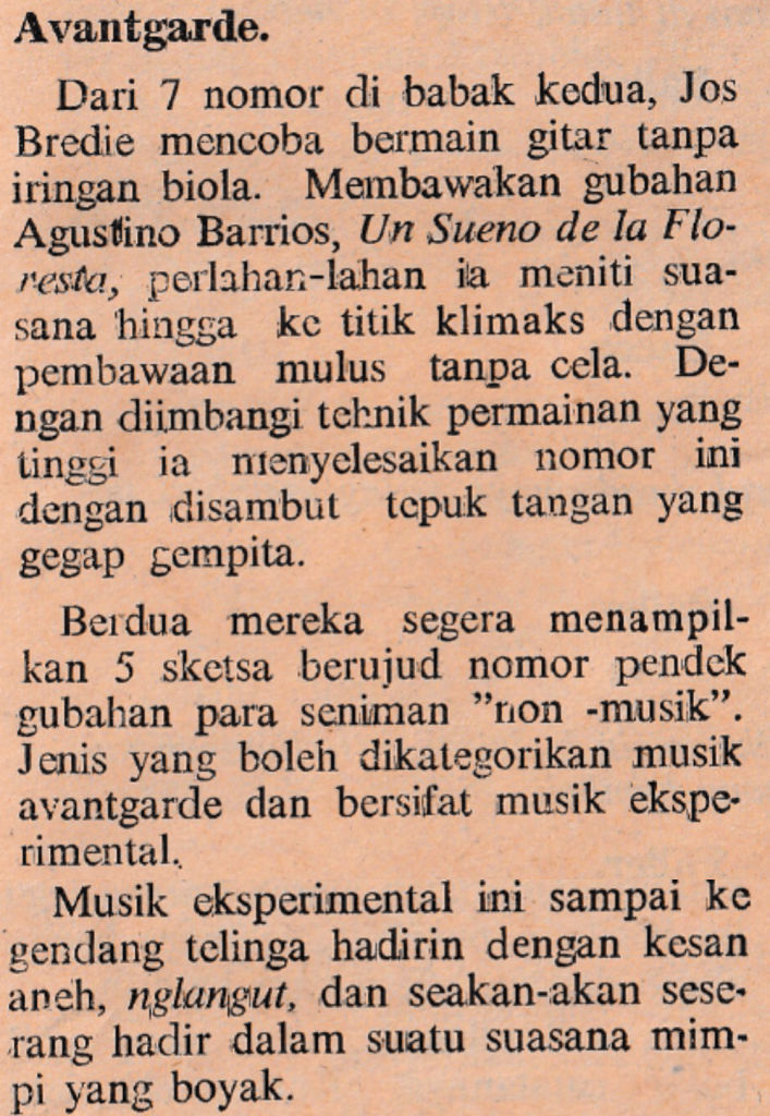 Sebagai pembuka kami akan memberi lampu sorot pada eksperimentasi kolaboratif dari lema berjudul “Konser Biola dan Gitar Ed. van Ness dan Jos Bredie” yang ditulis oleh Purnama Sidhi di Majalah Pusara No. 2 Tahun 1980 (sumbangan Bona Zustama).