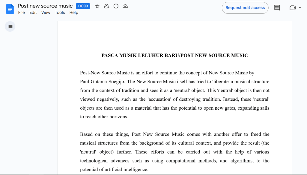 Paul Gutama Soegijo. The New Source Music itself has tried to ‘liberate’ a musical structure from the context of tradition and sees it as a ‘neutral’ object. This ‘neutral’ object is then not viewed negatively, such as the ‘accusation’ of destroying tradition. Instead, these ‘neutral’ objects are then used as a material that has the potential to open new gates, expanding sails to reach other horizons.Based on these things, Post New Source Music comes with another offer to freed the musical structures from the background of its cultural context, and provide the result (the ‘neutral’ object) further. These efforts can be carried out with the help of various technological advances such as using computational methods, and algorithms, to the potential of artificial intelligence.