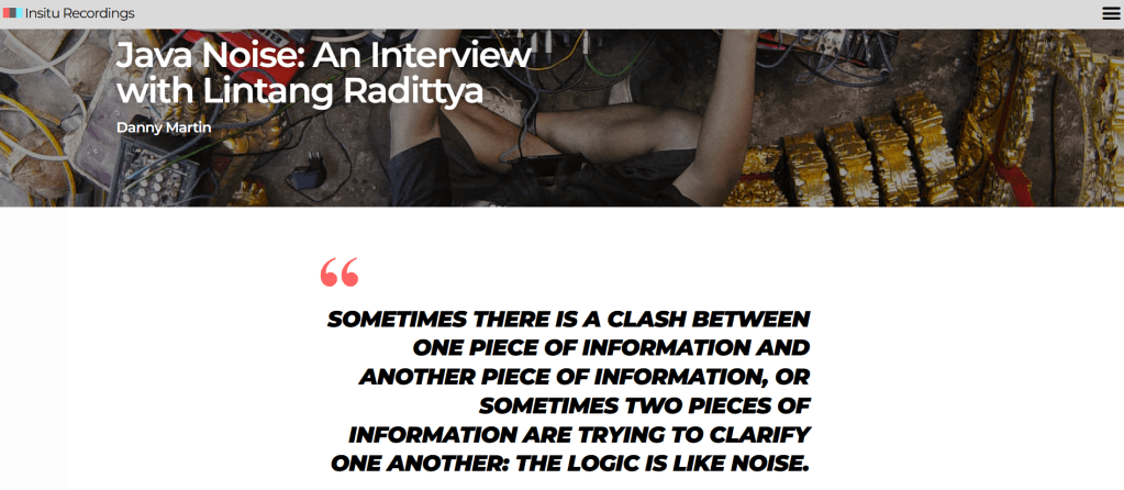 L: Basically, almost all of my work right now is related to noise, but noise in my work is not only about noise as a music or noise as a sound, but a different definition of noise. For example, if we talk about noise in Indonesia, it’s blended into our blood. Every day you can hear the adan (call to prayer) sound, or sounds from the crowded street. In many cases when there is a wedding ceremony, they use a really big sound system, and the people in the area aren’t disturbed. They feel okay. Or if you hear adan, everyone is like “it’s OK.” If you are from another country, maybe you will feel very disturbed with adan because they use a really bad speaker, or a horn. But here, every day we hear the adan sound that way, or we hear wedding ceremonies with big sound-systems, or during a campaign, people modify the exhaust on their motorcycles. We aren’t disturbed, because it’s like noise is blended into our blood. So it’s like we can have a different feeling about noise, because noise is in our blood. Sometimes if we talk about Javanese Philosophy, the people right now feel like it’s a very old thing, and say “why are you talking about old, unimportant things?” Because, it’s part of our blood. So, I try to separate that noise into different parts. I try to split it between us as humans and noise as something around humans. So my work till now has always talked about noise as an independent thing. Sometimes it’s really hard to split that thing, because it’s already blended with our blood.