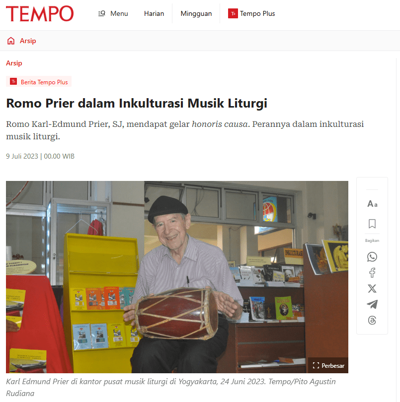 Tubuh Karl-Edmund Prier, SJ, berbalut toga hitam dan berkalung samir bergaris merah-putih di panggung Gedung Concert Hall Institut Seni Indonesia (ISI) Yogyakarta pada Kamis, 11 Mei lalu. Tokoh inkulturasi musik liturgi Indonesia itu resmi menyandang gelar honoris causa dari kampus seni tersebut. Sekretaris Senat ISI Yogyakarta I Wayan Dana menyebutkan gelar itu diberikan atas jasa luar biasa Romo Prier dalam bidang keilmuan musik.Namun pemberian gelar itu dinilai “kurang pas” oleh guru besar ISI, Djohan Salim. Pendapatnya itu terang-terangan ia sampaikan dalam sidang senat yang dipimpin Rektor ISI saat memutuskan pemberian gelar tersebut. Hal itu pun langsung disampaikan kepada Prier. “Romo Prier seharusnya mendapat gelar maestro, bukan honoris causa,” kata Djohan dengan tegas kepada Tempo, Senin, 3 Juli lalu.