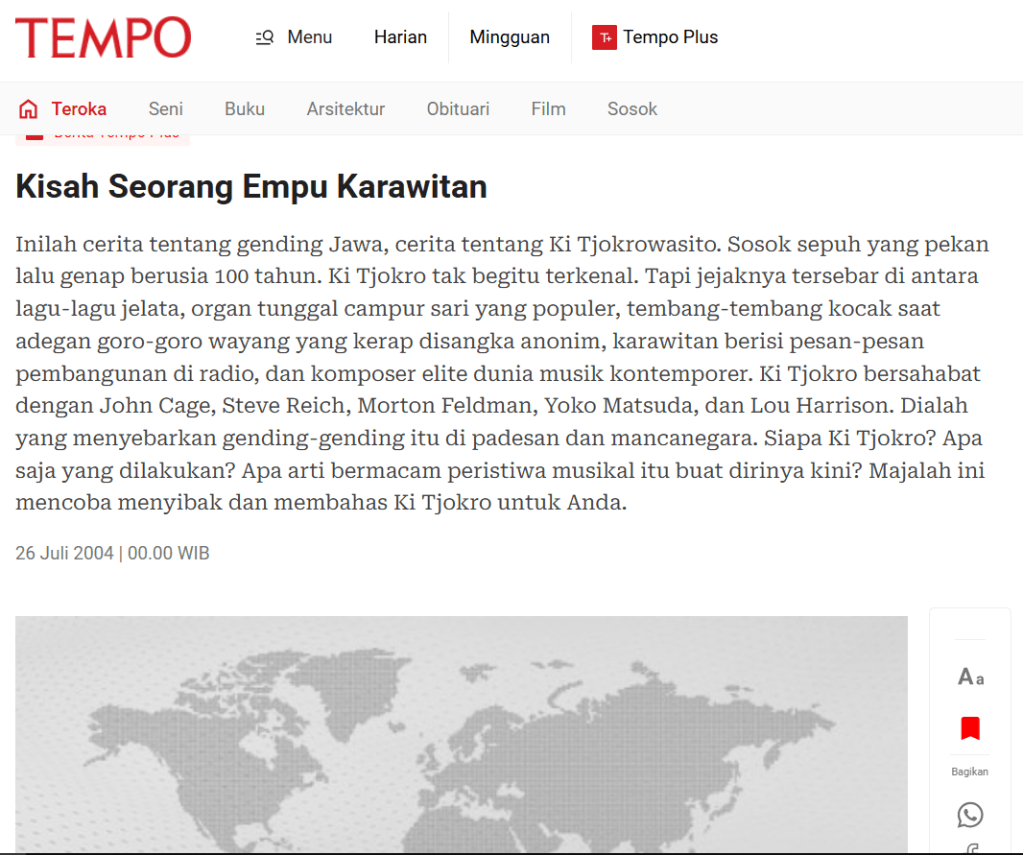 Inilah cerita tentang gending Jawa, cerita tentang Ki Tjokrowasito. Sosok sepuh yang pekan lalu genap berusia 100 tahun. Ki Tjokro tak begitu terkenal. Tapi jejaknya tersebar di antara lagu-lagu jelata, organ tunggal campur sari yang populer, tembang-tembang kocak saat adegan goro-goro wayang yang kerap disangka anonim, karawitan berisi pesan-pesan pembangunan di radio, dan komposer elite dunia musik kontemporer. Ki Tjokro bersahabat dengan John Cage, Steve Reich, Morton Feldman, Yoko Matsuda, dan Lou Harrison. Dialah yang menyebarkan gending-gending itu di padesan dan mancanegara. Siapa Ki Tjokro? Apa saja yang dilakukan? Apa arti bermacam peristiwa musikal itu buat dirinya kini? Majalah ini mencoba menyibak dan membahas Ki Tjokro untuk Anda.