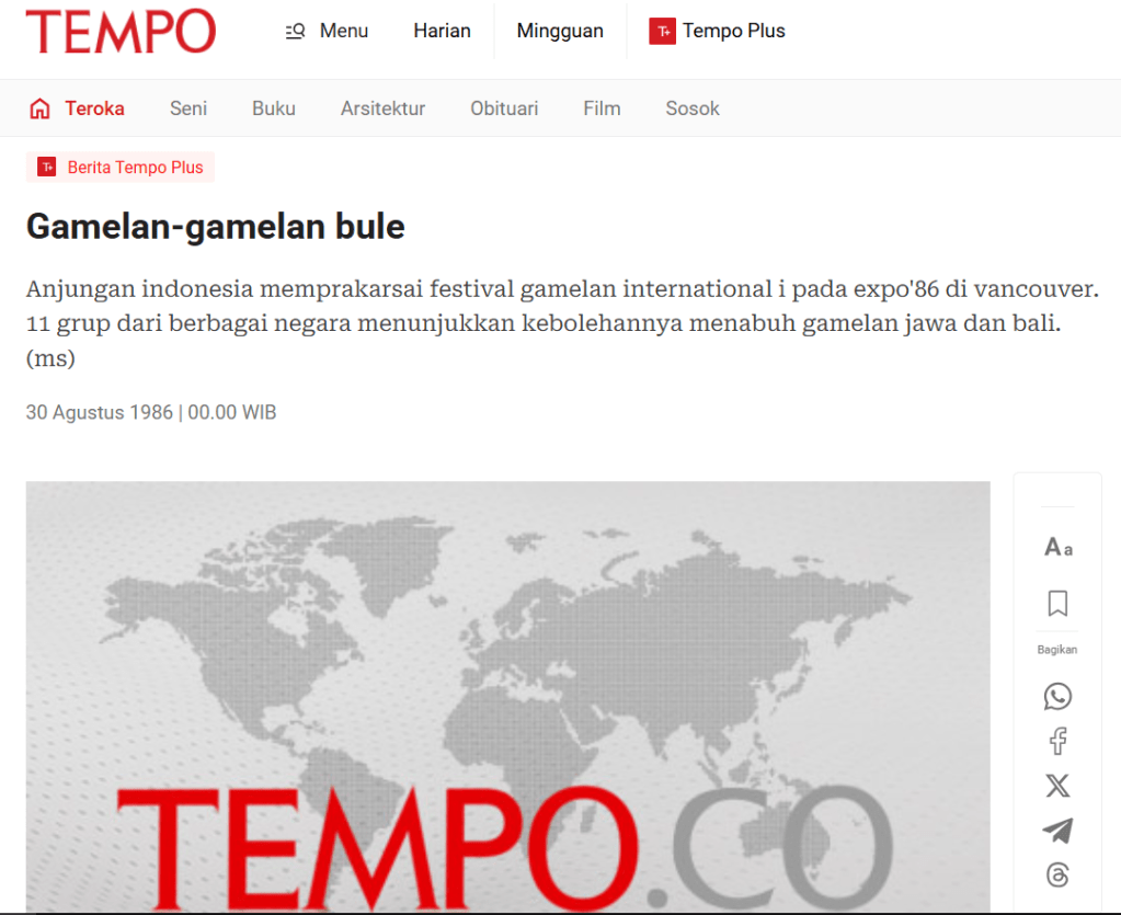 Selama tiga hari — Senin sampai Rabu pekan lalu — anjungan Indonesia di Expo ’86 Vancouver, Kanada, memang menampilkan “yang aneh-aneh” dari gamelan. Mulai dari pemainnya, yang sebagian besar berkulit putih, sampai peralatan dan ciptaan yang ditampilkan 11 grup gamelan dari Indonesia, AS, Jepang, dan Jerman Barat serta satu orkes simfoni dari kota penyelenggara ekspo, dalam 29 kali konser. Istimewa juga bahwa acara tersebut dihadiri ribuan orang berbagai