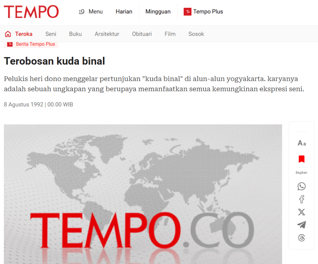 Pelukis heri dono menggelar pertunjukan “kuda binal” di alun-alun yogyakarta. karyanya adalah sebuah ungkapan yang berupaya memanfaatkan semua kemungkinan ekspresi seni.