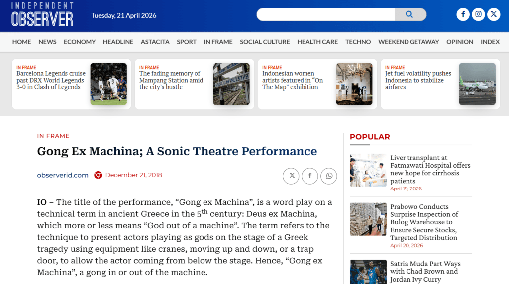 The title of the performance, “Gong ex Machina”, is a word play on a technical term in ancient Greece in the 5th century: Deus ex Machina, which more or less means “God out of a machine”. The term refers to the technique to present actors playing as gods on the stage of a Greek tragedy using equipment like cranes, moving up and down, or a trap door, to allow the actor coming from below the stage. Hence, “Gong ex Machina”, a gong in or out of the machine.