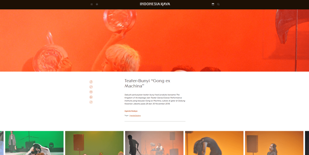 Sebuah pertunjukan teater-bunyi hasil produksi bersama The Kingdom of Archipelago dan Teater Garasi/Garasi Performance Institute yang berjudul Gong ex Machina, sukses di gelar di Gedung Kesenian Jakarta pada 29 dan 30 November 2018.